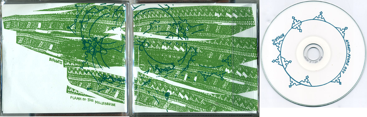 NP024 Binges - Flame of the Millenium CD-R Finally a release on Night-People from Raccoo-oo-oon tour mates and Chicago's best basement improv unit Binges. Killer drums, percussion, electronics, saxophone, guitar, and bass from these two dudes Chris and Anthony. Binges are ultra focused and tight, Chris glides around on his kit with supreme precision with Anythony juggles a bunch of loops, noises, and instruments all at once. One of the most solid and exciting underground bands around right now. Artwork by the band printing by SDRreed. |